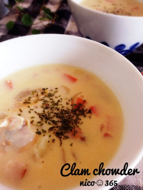 【下準備】野菜、ベーコンは角切り。じゃがいもは水に浸す。あさりはこすり洗いをしておく。