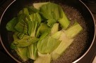 鍋でスープを温めます。沸騰したら①の茎を入れて1分煮ます。