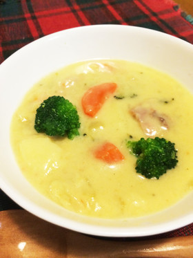 じゃがいもを加えて柔らかくなったら、1のルウを加えてとろみをつける。牛乳を加えて温めて、しお、コショウで味を整える。