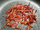 ベーコンを2~3㎜の幅に切り、極弱火のフライパンでカリカリになるまで炒めます。