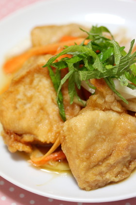 鶏肉に小麦粉を薄くまぶす。フライパンに1cm深さぐらい油を入れ、中温で揚げる。