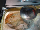 220℃に予熱したオーブンで40分前後焼きます。途中で2〜3回汁を肉にかけます。
