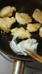 鶏肉に片栗粉を薄くまぶす。フライパンに油を多めにいれて温め、鶏肉を強火で両面こんがり焼く。まだ中まで火を通さないで!