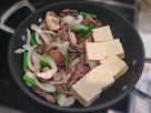 《材料A》に8割火が通ったら、牛肉と一緒に端に寄せる。余った場所に《豆腐》を入れる。
