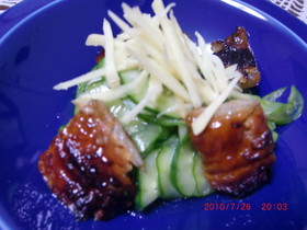 お皿に②を山のように盛り、周りに④のうなぎを置き、上に生姜をのせる。①をかけていただく。