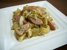 フライパンにオリーブオイルを熱し、玉ねぎ・ウインナーを入れて塩・こしょうで玉ねぎがしんなりするまで炒める。