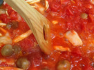 (13)がフツフツしてきたら火加減は《弱めの中火》にする。トマトを潰し混ぜながら《7分(レシピ分量で)》煮詰めます。
