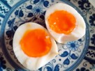 鍋に水を入れて中火にかけ、沸騰したら玉子をそっと入れて、7~8分茹でる。この茹で方だと、黄身が半熟になります。
