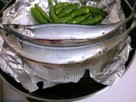 フライパンにサラダ油か、フライパン用ホイルをひいて熱し、サンマを焼く。写真は、付け合わせのししとうも焼いています。