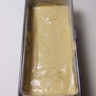 生地にツヤが出て滑らかになったら、油を塗り敷き紙を敷いたパウンド型に流し込む。真ん中を少し凹ませ、上下を少し高くする。