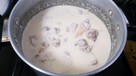 にんにく、すりおろした玉ねぎ、コンソメスープの素、牛乳、生クリームを入れ10~15分弱火で煮込む。