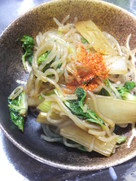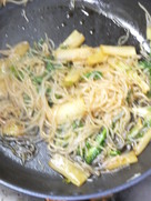 セロリの葉のぶつ切りを入れて1分ほど炒める。