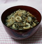 炊込みご飯で炊き、盛り付けて最後にゴマをかけて出来上がり。
