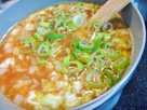 トマトベースを入れて今回は白ネギの青い部分も調子こいて入れてみましたあじ塩で味を整えます