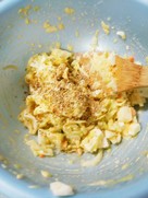 ③にベビーチーズ、ゆでたまご、マヨネーズを加えて混ぜ合わせます。