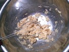 粉っぽさが無くなったら、牛乳を入れて混ぜ、生地をまとめる。