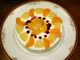 ブルーベリーソースをポタポタとたらし、周囲に缶詰を飾ります。