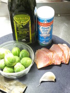 芽キャベツは汚れた部分を切り落としたりむいてから洗い、生ハムはこま切れに、にんにくはつぶしておく。