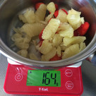 鍋を秤にのせ0に合わせ、果実の重さを測る。