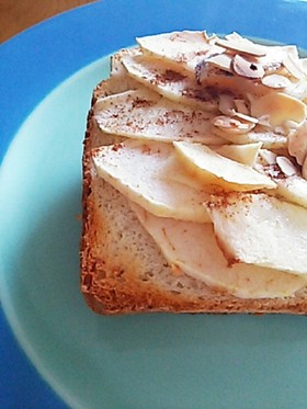 りんごとアーモンドのトースト 薄切りのりんごをたっぷりとのせました。甘酸っぱくて、カリカリのトーストです。 りんごとアーモンドのトースト りんご 食パン シナモン グラニ