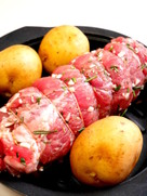 肉を巻いてタコ糸で縛り、表面に残りのハーブ類とにんにくを擦り込む。