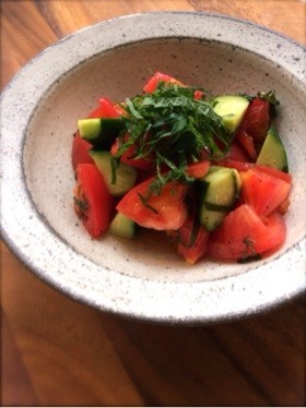 トマト、きゅうり、大葉に●の調味料を加え、よく和えて冷蔵庫で1時間馴染ませたら♪