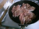 フライパンにサラダ油をひいて熱し、鶏モモ肉を、皮目(皮の付いていた面)から焼く。