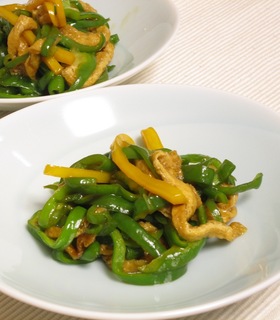 ピーマンと油揚げは5ミリ幅の細切りにし、耐熱の器に入れ片栗粉をまんべんなくまぶす。(出来れば油揚げは油抜きしておく)
