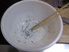 ボウルに薄力粉、水、塩、大葉、炒りごまを入れて混ぜる