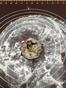 打ち粉をして優しく広げて中心にクリームチーズを置いて周りに軽くオリーブオイルを塗る。