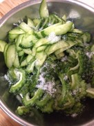 ボウルに入れて塩をまぶしてしばらくおく。水が出てきたら、ぎゅっと絞る