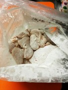 鶏むね肉に塩コショウを揉み込む。ビニール袋に薄力粉と肉を入れ、空気を入れて袋の口を閉じ振る。全体に粉がついたらOK。
