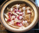 土鍋に水を切った米、たこ、水を切ったごぼう、まいたけ、水、ほんだしを加えます。
