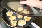 スプーンを二本用意する。タネをすくい取り、フライパンの中で形を整える。全て並べたら中火にして焼いていく。
