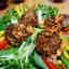 13のソースを大皿のハンバーグに回しかける。グリーンリーフで切ったハンバーグと他の野菜をはさんで食べます