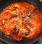 フライパンでトマト缶、顆粒コンソメ、バター、すりおろしにんにくを加え、3のあさりを煮汁ごと加えます。