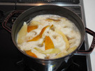 (3)を時々優しく混ぜながら沸騰させる。沸騰し始めたら鍋蓋をします。そして火加減はそのままで『40秒』加熱します。