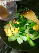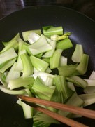 チンゲン菜の葉の部分とみじん切りにした生姜も炒める。