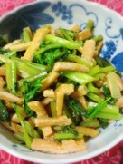 熱したフライパンにゴマ油を入れ、かぶの葉を茎➡葉の順に入れ、油あげも加え、さっといためる。