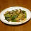 ◎を入れて、絡め、炒めます。最後に酒を振り入れ、つぶ唐辛子を入れて混ぜます。