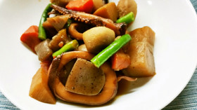人参、ごぼう、蓮根、筍の酢漬けは乱切りこんにゃく1.5cm角切里芋は冷凍を使います