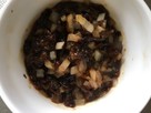 プルーンと玉ねぎは微塵切りにし、耐熱容器に入れ赤ワインと粉末ブイヨンを加え混ぜ、600Wレンジで2分程加熱する。
