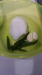 タマネギ、ニンニク、トウガラシを、軽くレンチンしておきます。