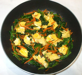4cmの長さに切ったほうれん草の葉を加え、サッと炒め