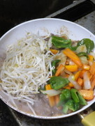 すぐに火が通るので、焼けたラム肉の上に皿に取りおいてあった炒めた野菜ともやしを入れる。