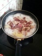 生姜は薄切りでも、千切りでもOKです。フライパンにレバー・レバーが被るくらいの料理酒・生姜の半量を入れます。