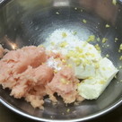 長ネギをみじん切りに刻む。鶏ひき肉と豆腐(水切り不要)と□の調味料をよく混ぜ合わせる。