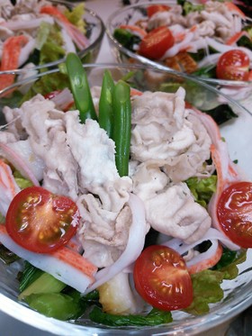 野菜たっぷりの豚しゃぶサラダ いろんな野菜をどっさり入れて、ポン酢とマヨネーズの相性がバッチリです♪ 材料 豚肉(しゃぶしゃぶ用) 1パック サニーレタス 3枚 小松菜 適量