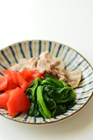 冷ましておいた2にほうれん草、豚肉、パプリカを入れ、全体が浸かるように広げ、10分ほどそのままにして味を染み込ませる。
