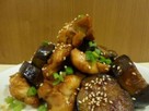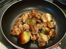 茄子は皮をはいで、輪切りし、水の中で灰汁を除きます。鶏肉は一口サイズを切って、塩コショウを適量かけます